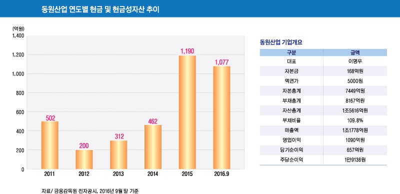 동원산업의 현금 및 현금성자산은 지난 2011년 502억원, 2012년 200억원, 2013년 312억원, 2014년 462억원, 2015년 1190억원으로 나타났다.