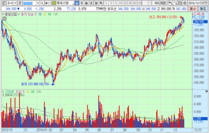 동원산업의 주가는 23일 종가 34만4500원으로 올해 2월 6일의 저점 23만7000원에 비해 45.4% 상승한 수준에서 거래되고 있다.