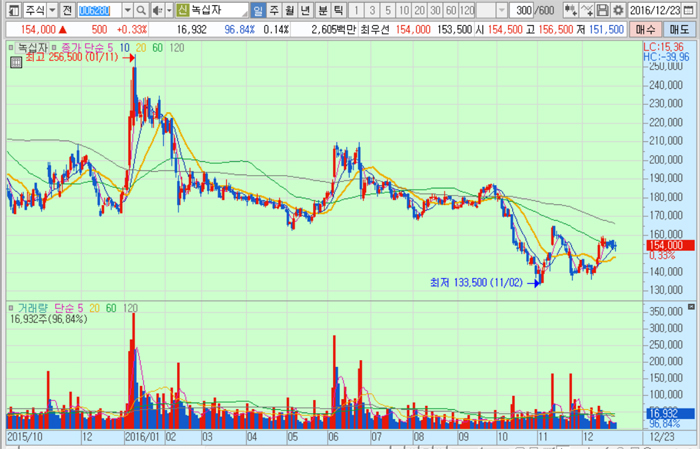 녹십자의 주가는 23일 종가 15만4000원으로 올해 11월 2일의 저점 13만3500원에 비해 15.4% 오른 수준에서 거래되고 있다.