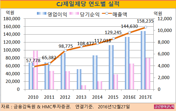 HMC투자증권 조용선 연구원은 CJ제일제당의 올해 연결기준 매출액이 14조4630억원(전년비 +11.9%), 영업이익 8910억원(전년비 +18.6%), 당기순이익 4410억원(전년비 +73.8%)을 기록할 것으로 내다보고 있다.