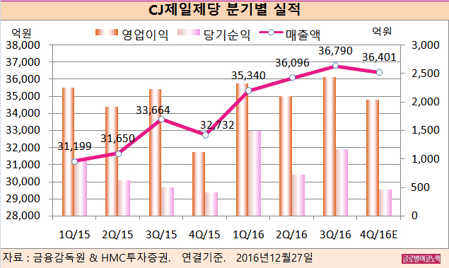 조 연구원은 CJ제일제당의 올해 4분기 연결기준 매출액 3조6401억원(전년동기비 +11.2%), 영업이익 2046억원(전년동기비 +83.0%)을 기록할 것으로 보고 있다. 지배주주 순이익은 461억원이며 OPM은 5.6%에 이를 것으로 전망된다.