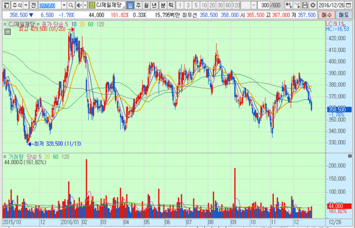 CJ제일제당의 주가는 26일 종가 35만8500원으로 올해 1월 20일의 고점 42만9500원에 비해 16.5% 하락한 수준에서 거래되고 있다.