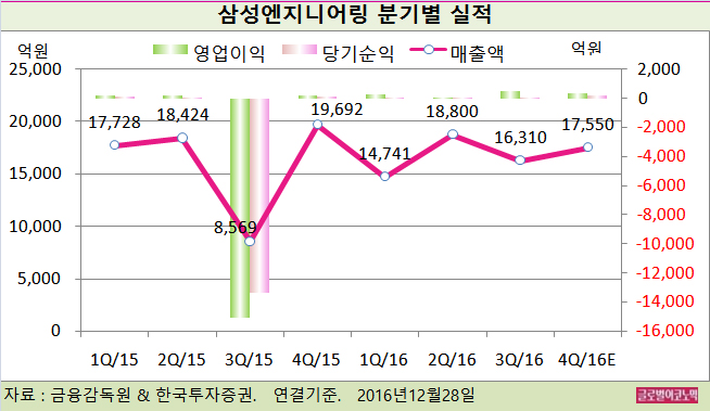 이 연구원은 삼성엔지니어링의 올 4분기 연결기준 매출액이 1조7550억원(전년동기비 -10.9%), 영업이이 370억원(전년동기비 +68.9%), 당기순이익 210억원(전년동기비 +29.6%)에 이를 것으로 보고 있다.