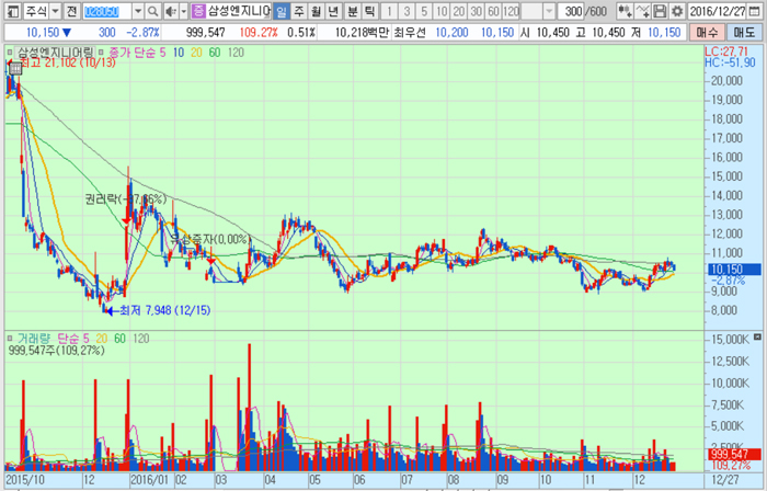 삼성엔지니어링의 주가는 27일 종가 1만150원으로 지난해 10월 13일의 고점 2만1102원에 비해 51.9% 하락한 수준에서 거래되고 있다.