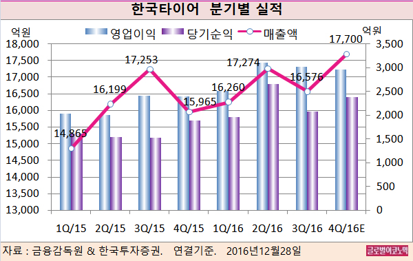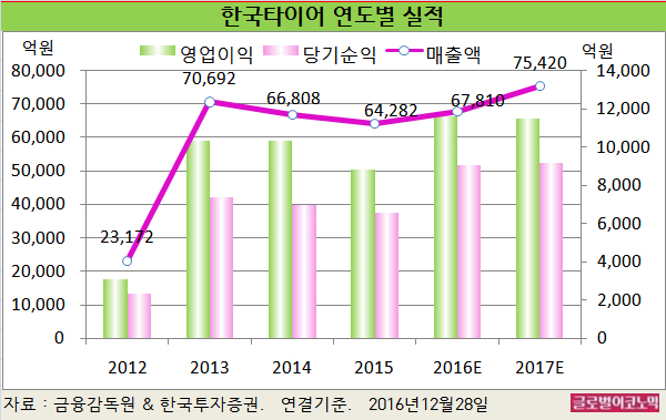 김 연구원은 “2017년에는 5년 만에 가격인상이 본격화되면서 매출성장이 마진축소를 방어할 전망”이라며 “한국타이어는 배당 증액에 대해서는 여전히 보수적으로 접근 중”이라고 판단했다.