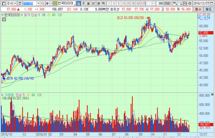 한국타이어의 주가는 27일 종가 5만7800원으로 올해 9월 28일의 고점 6만3200원에 비해 8.5% 하락한 수준에서 거래되고 있다.