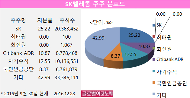SK텔레콤의 주주분포는 최대주주가 SK로 지분 25.22%(2036만3452주), 최태원 SK그룹 회장 100주, 최신원 SKC그룹 회장 1067주, 자사주 12.55%(1013만6551주), Citibank ADR 10.87%(877만8468주), 국민연금 8.37%(676만1897주)를 보유하고 있다.