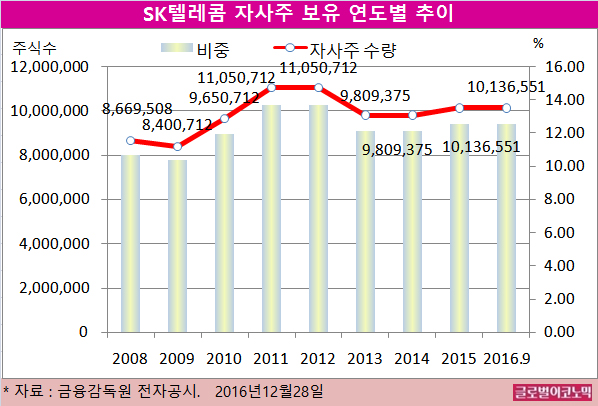 올해 9월 말 현재 SK텔레콤의 자사주는 1013만6551주로 전체 발행주식의 12.55%에 달한다.