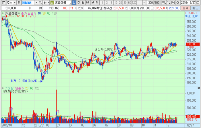 SK텔레콤의 주가는 27일 종가 23만1000원으로 올해 1월 21일의 저점 19만1500원에 비해 20.6% 상승한 수준에서 거래되고 있다.