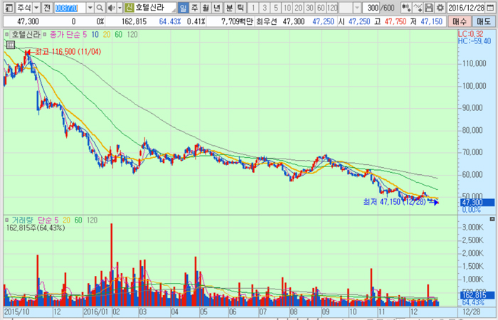 호텔신라의 주가는 28일 종가 4만7300원으로 지난해 11월 4일의 고점 11만6500원에 비해 59.4% 하락한 수준에서 거래되고 있다.
