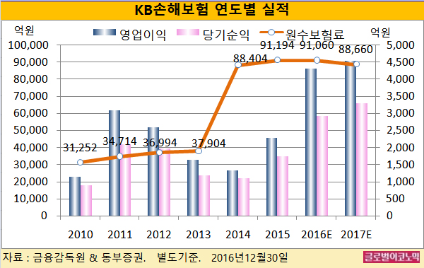 이어 2017년에는 별도기준 원수보험료 8조8660억원(전년비 -2.6%), 영업이익 4540억원(전년비 +5.1%), 당기순이익 3290억원(전년비 +12.7%)에 이를 전망이다.