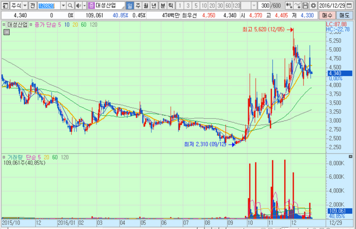 대성산업의 주가는 구랍 29일 종가 4340원으로 지난해 9월 12일의 저점 2310원에 비해 87.9% 상승한 수준에서 거래되고 있다.