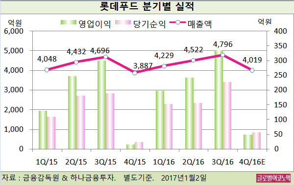 심 연구원은 롯데푸드의 2016년 별도기준 매출액이 1조7565억원(전년비 +2.9%), 영업이익 822억원(전년비 +18.8%), 당기순이익 595억원(전년비 +18.3%)으로 전망하고 있다.