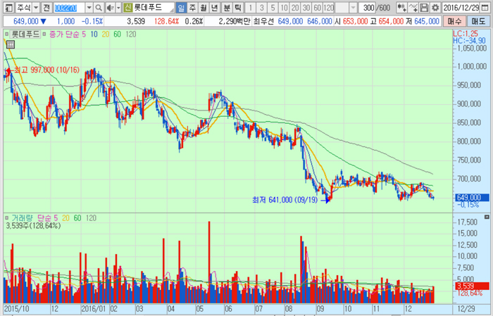 롯데푸드의 주가는 구랍 29일 종가 64만9000원으로 2015년 10월 16일의 고점 99만7000원에 비해 34.9% 하락한 수준에서 거래되고 있다.