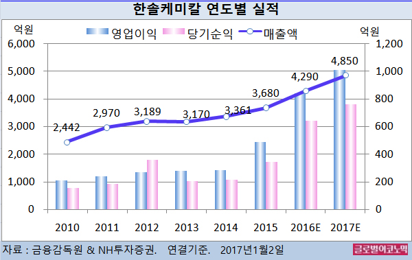 황 연구원은 한솔케미칼이 2016년에는 연결기준 매출액 4290억원(전년비 +16.6%), 영업이익 840억원(전년비 +71.4%), 당기순이익 640억원(전년비 +86.6%)으로 전망했다.
