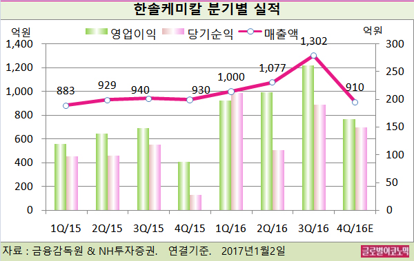 황 연구원은 한솔케미칼의 2016년 4분기 연결기준 매출액이 910억원(전년동기비 -2.2%), 영업이익 164억원(전년동기비 90.0%), 지배주주 순이익 150억원으로 추정하고 있다.