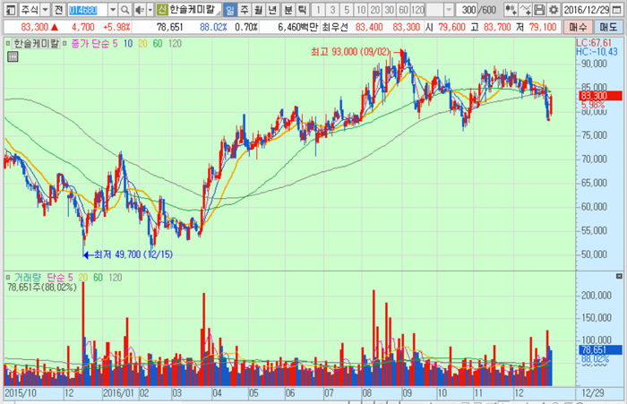 한솔케미칼의 주가는 구랍 29일 8만3300원으로 지난해 9월 2일의 9만3000원에 비해 10.4% 하락한 수준에서 거래되고 있다.