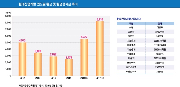 2016년 9월 말 현재 현대산업은 현금 및 현금성자산 8210억원, 단기금융상품 4429억원, 매출채권 7577억원, 재고자산 7301억원 등 유동자산 규모가 3조5179억원에 이른다.