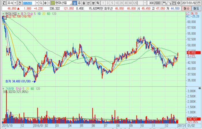 현대산업개발 주가는 2일 4만6850원으로 2015년 10월 16일의 6만2700원에 비해 25.3% 하락한 수준에서 거래되고 있다.