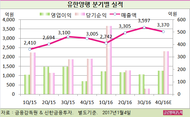 배 연구원은 유한양행의 2016년 4분기 실적은 컨센서스(매출액 3401억원, 영업이익 196억원)에 부합할 것으로 평가했다.