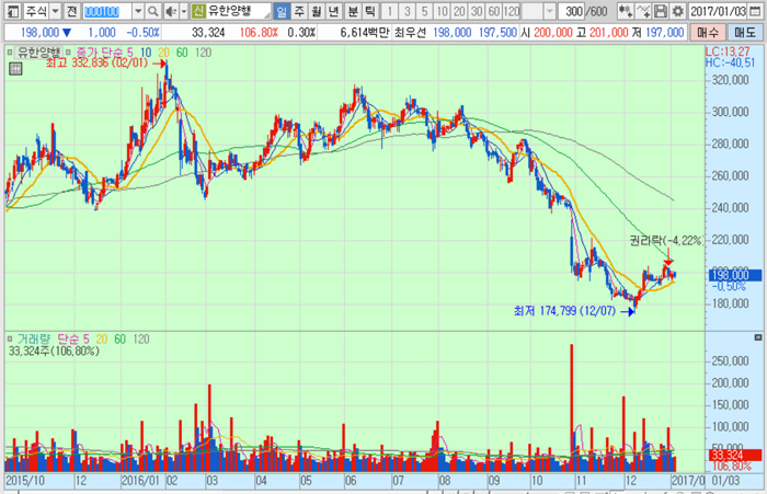 유한양행의 주가는 3일 종가 19만8000원으로 2016년 2월 1일의 고점 33만2836원에 비해 40.5% 하락한 수준에서 거래되고 있다.