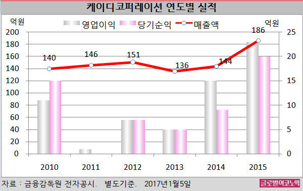KD코퍼레이션은 2015년 매출과 순이익이 비교적 다른 해에 비해 좋아진 것으로 나타났다.