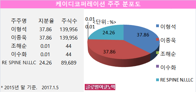 케이디코퍼레이션의 최대주주로는 이형석 대표와 이종욱씨가 각각 37.86%(13만9956주)를 보유하고 있다. 르 스파인(RE SPINE)이 24.96%(8만9689주)를 갖고 있다.