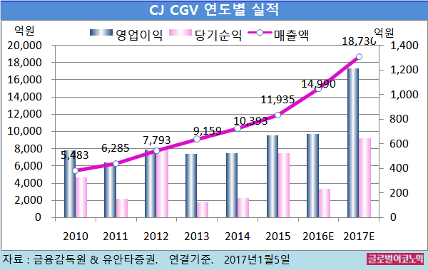 2016년에는 CJ CGV의 연결기준 매출액이 1조4990억원(전년비 +25.6%), 영업이익 680억원(전년비 +1.6%), 당기순이익 236억원(전년비 -54.8%)에 이를 전망이다.