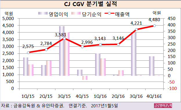 CJ CGV의 2016년 4분기 예상 연결실적은 매출액 4480억원(전년동기비 +50%), 영업이익 154억원(전년동기비 +220%), 당기순이익 4억원(흑자전환)을 기록할 전망이다.