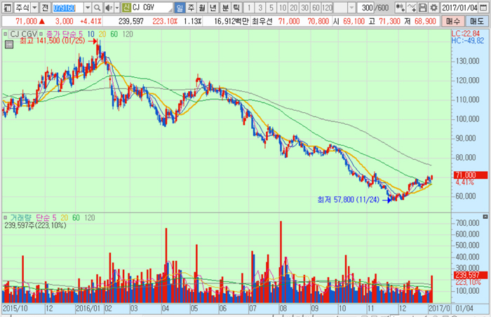 CJ CGV의 주가는 4일 종가 7만1000원으로 2016년 1월 25일의 고점 14만1500원에 비해 49.8% 하락한 수준에서 거래되고 있다.