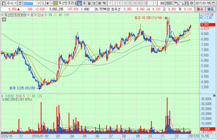두산인프라코어의 주가는 5일 종가 9350원으로 2016년 1월 20일의 저점 3375원에 비해 177.0% 상승한 수준에서 거래되고 있다.
