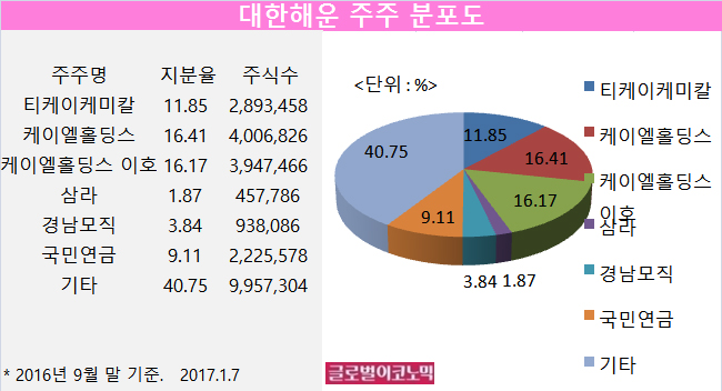 대한해운의 최대주주는 2016년 9월 말 현재 ㈜티케이케미칼이며 지분 11.85%(289만3458주)를 보유하고 있고 티케이케미칼을 포함해 특수관계인 지분이 50.19%(1226만485주)에 이른다.