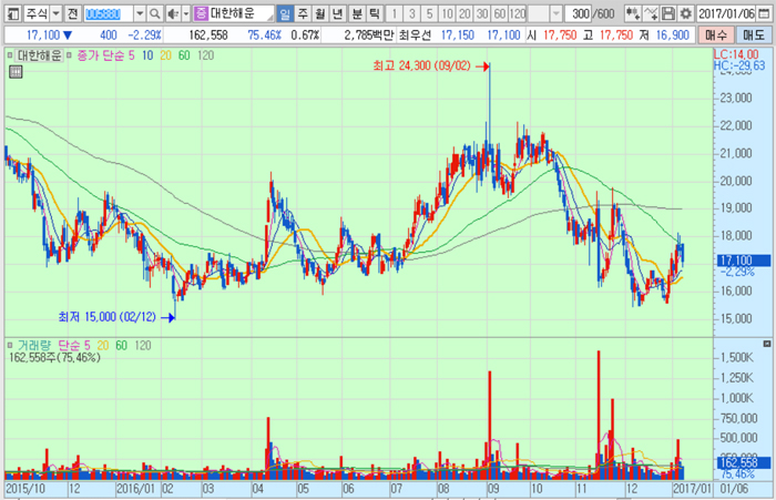 대한해운의 주가는 6일 종가 1만7100원으로 2016년 9월 2일의 고점 2만4300원에 비해 29.6% 하락한 수준에서 거래되고 있다.