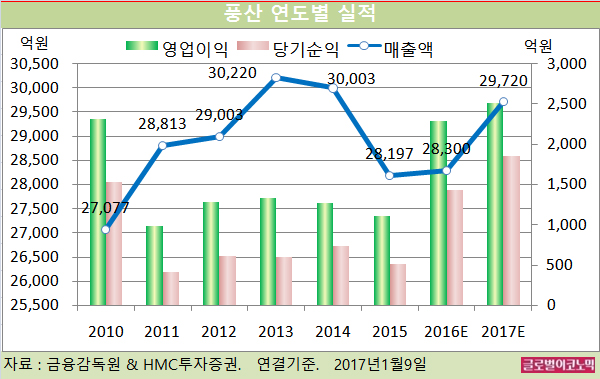 풍산의 2016년 4분기 연결기준 매출액은 8100억원(전년동기비 +10.9%), 영업이익 709억원(전년동기비 +174.8%), 당기순이익 430억원(전년동기비 +249.6%)에 이를 전망이다.