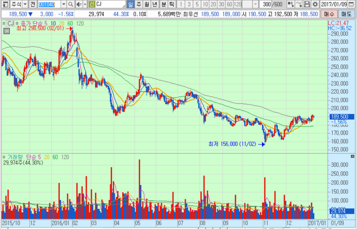 CJ의 주가는 9일 종가18만9500원으로 2016년 11월 2일의 저점 15만6000원에 비해 21.5% 상승한 수준에서 거래되고 있다.