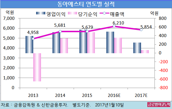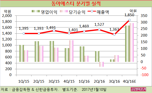 신한금융투자 배기달 연구원은 동아에스티의 2016년 4분기 별도기준 매출액이 1850억원(전년동기비 +32.1%), 영업이익 276억원(전년동기비 +168.0), 당기순이익 294억원(전년동기비 +80.4%)을 기록할 것으로 전망했다.