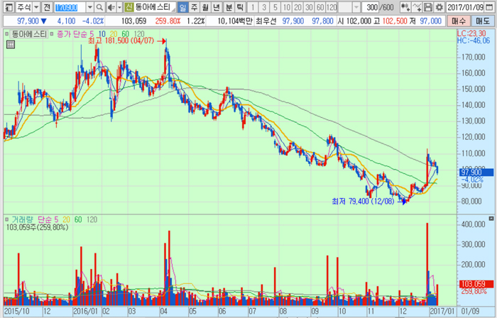 동아에스티의 주가는 9일 종가 9만7900원으로 2016년 4월 7일의 고점 18만1500원에 비해 46.1% 하락한 수준에서 거래되고 있다.