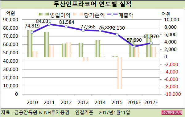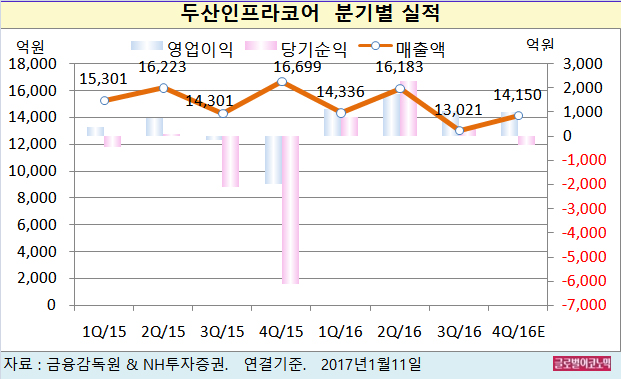 유 연구원은 두산인프라코어의 2016년 4분기 연결기준 매출액이 1조4150억원(전년동기비 -15.3%), 영업이익 1020억원(흑자전환), 지배부주 순익 -370억원(적자지속)에 이를 것으로 예상하고 있다.