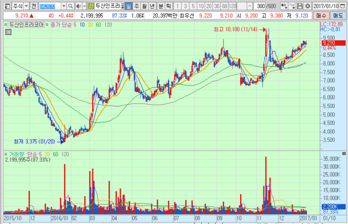 두산인프라코어의 주가는 10일 종가 9210원으로 2016년 1월 20일의 저점 3375원에 비해 172.9% 상승한 수준에서 거래되고 있다.