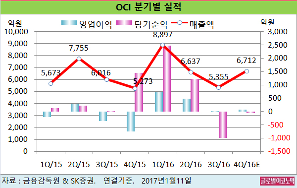 손 연구원은 OCI의 2016년 4분기 연결기준 매출액이 6712억원(전년동기비 +27.3%), 영업이익 69억원(흑자전환), 지배주주 순이익 -59억원(적자전환)으로 예상하고 있다.