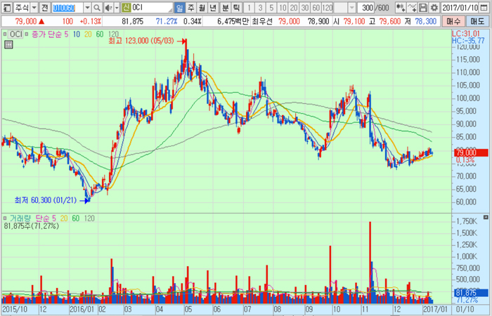 OCI의 주가는 10일 종가 7만9000원으로 2016년 5월 3일의 고점 12만3000원에 비해 35.8% 하락한 수준에서 거래되고 있다.