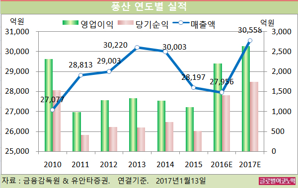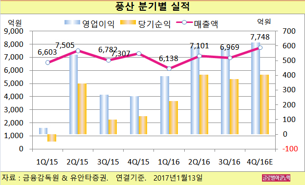 이 연구원은 풍산의 2016년 4분기 연결기준 매출액이 7748억원(전년동기비 +6.0%), 영업이익 624억원(전년동기비 +141.9%), 당기순이익 405억원(전년동기비 +229.3%)으로 예상하고 있다.