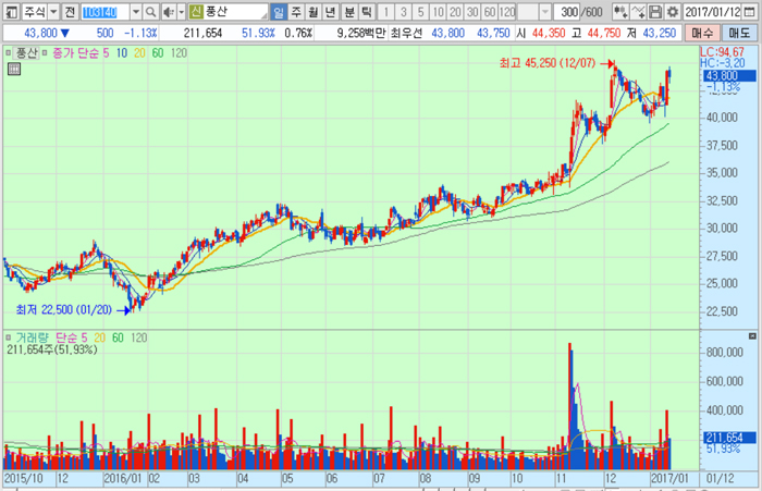 풍산의 주가는 12일 종가 4만3800원으로 2016년 1월 20일의 2만2500원에 비해 94.7% 상승한 수준에서 거래되고 있다.