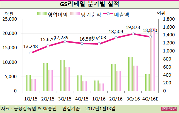 GS리테일의 2016년 4분기 연결기준 매출액은 1조8870억원(전년동기비 +13.9%), 영업이익 420억원(전년동기비 +8.2%), 당기순이익 1569억원(전년동기비 556.5%)에 이를 전망이다.