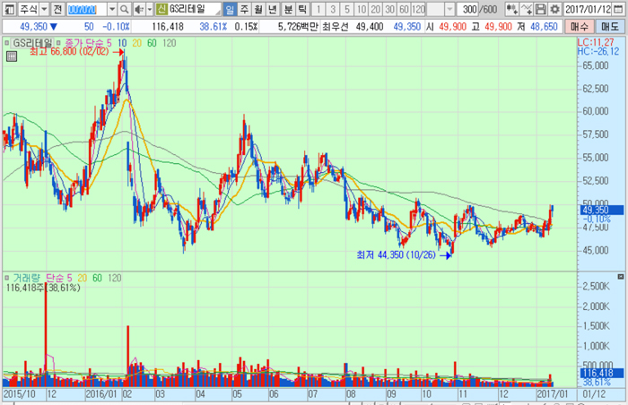 GS리테일의 주가는 12일 종가 4만9350원으로 2016년 2월 2일의 고점 6만6800원에 비해 26.1% 하락한 수준에서 거래되고 있다.