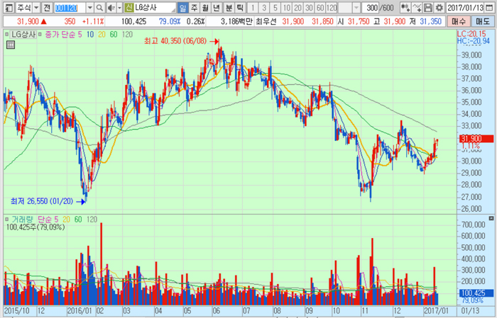 LG상사의 주가는 13일 종가 3만1900원으로 2016년 6월 8일의 고점 4만350원에 비해 20.9% 하락한 수준에서 거래되고 있다.