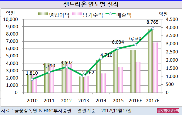 HMC투자증권 강양구 연구원은 셀트리온의 올해 연결기준 매출액 8765억원(전년비 +34.2%), 영업이익 3914억원(전년비 +50.0%), 당기순이익 3077억원(전년비 +63.9%)을 기록할 것으로 내다보고 있다.