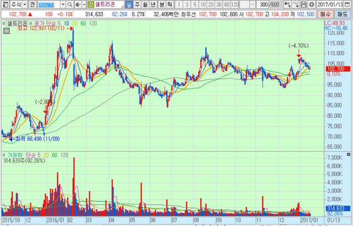 셀트리온의 주가는 13일 종가 10만2700원으로 2016년 9월 11일의 고점 12만2937원에 비해 16.5% 하락한 수준에서 거래되고 있다.