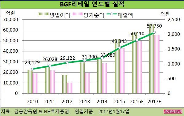 NH투자증권 이지영 연구원은 BGF리테일의 올해 연결기준 매출액이 5조7750억원(전년비 +14.6%), 영업이익 2330억원(전년비 +13.1%), 당기순이익 1980억원(+12.5%)을 기록할 것으로 내다보고 있다.