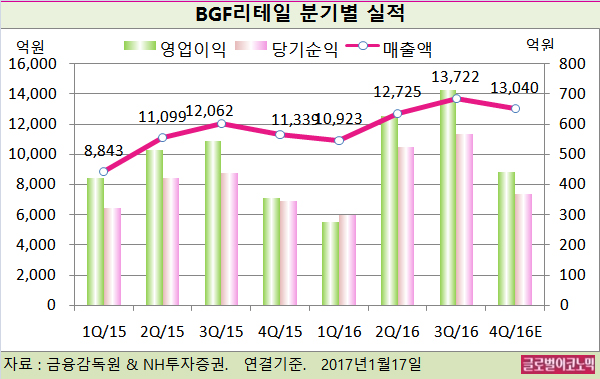 BGF리테일의 지난해 4분기 연결기준 매출액은 1조3040억원(전년동기비 +15.0%), 영업이익 441억원(전년동기비 +24.2%), 지배주주 순이익 369억원(전년동기비 6.6%)에 이를 전망이다.